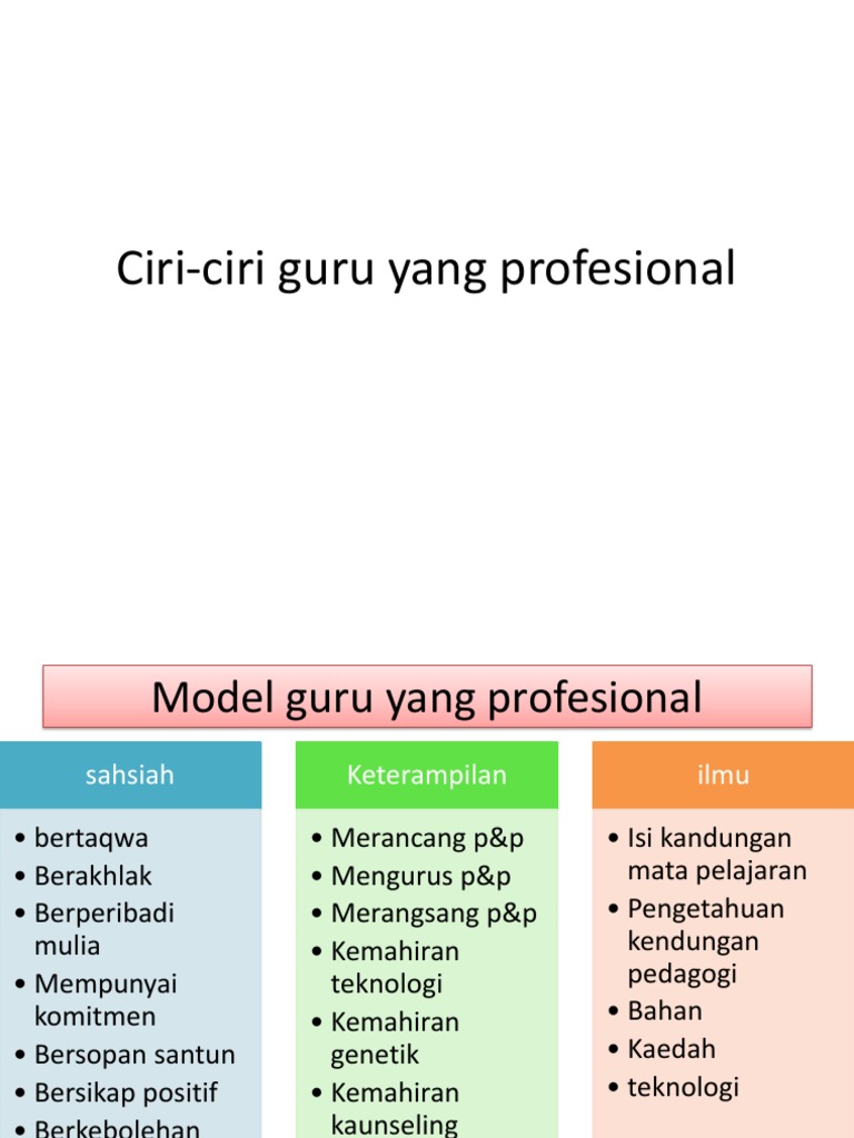 Oleh samhis setiawan Diposting pada 3 Juli 2022. Guru yang professional berkebolehan mencorak kualiti pengajaran Guru sebagai ahli professional perlu mempertahankan kualiti dan kecemerlangan tugas dan tanggungjawab dengan membuat pelbagai. CIRI-CIRI DAN KUALITI GURU YANG PROFESIONAL 2.
