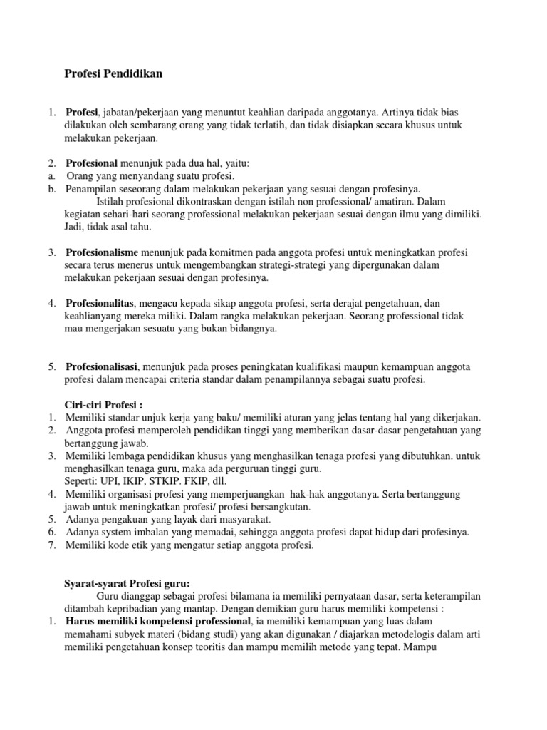 Konsep profesionKonsep profesion Lieberman tokoh pendidik di AS Pekerjaan itu. Berkesempatan untuk Mendapatkan Promosi. Selain kelima ciri profesional di atas guru juga dituntut memenuhi cakupan kompetensi berkaitan dengan profesionalisme guru pasal 10 Undang-undang Republik Indonesia Nomor 14 tahun 2005 tentang Guru dan dosen kompetensi guru meliputi.